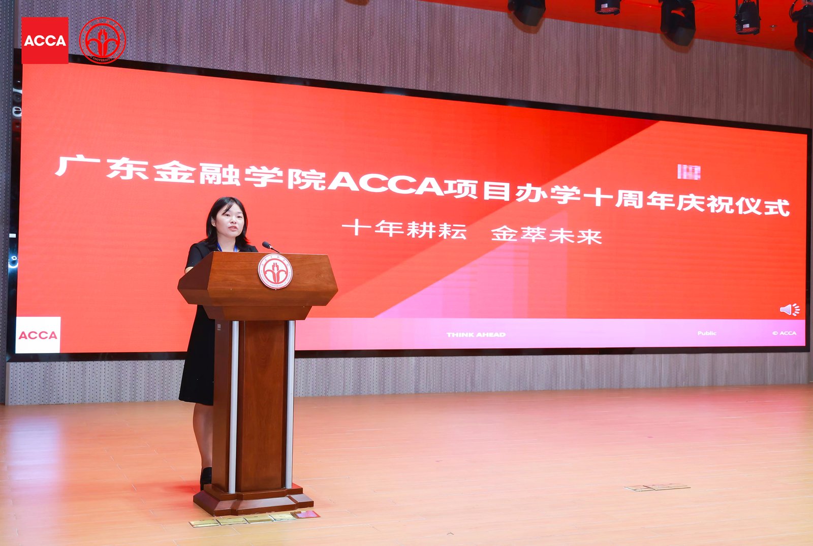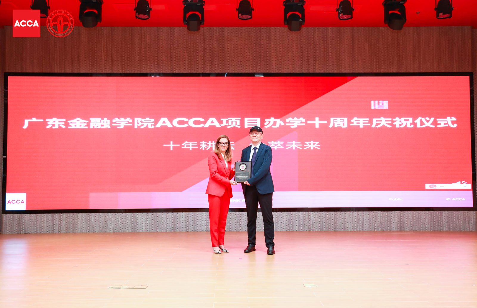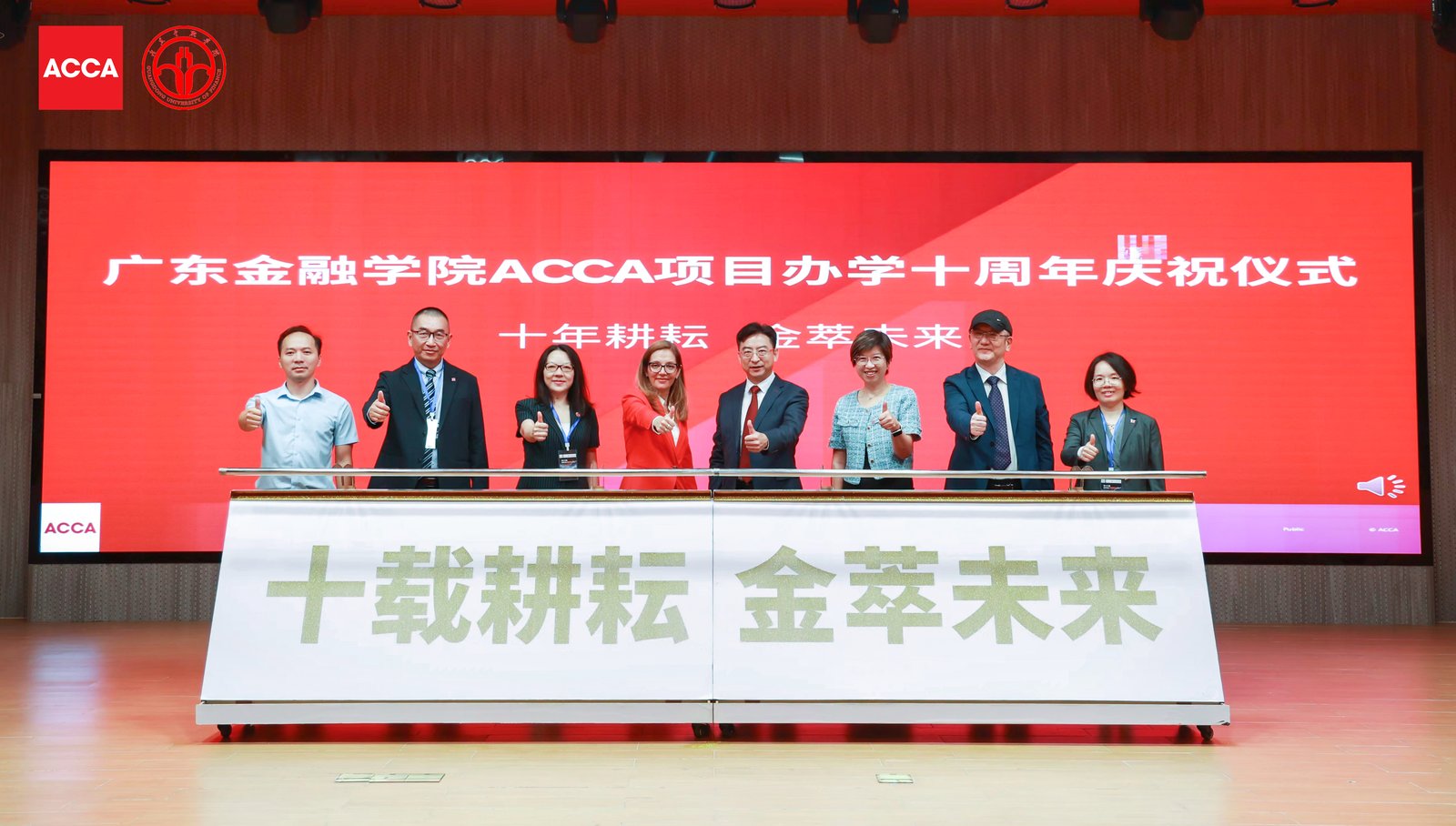 广东金融学院会计学院ACCA 项目始终坚持高标准、国际化的人才培养路径,将 ACCA 专业资格与学位教育深度融合。2022 年,广东金融学院更成功申请成为“ACCA 黄金级教育机构”,项目教师屡获 ACCA 优秀教师殊荣。广东金融学院会计学院ACCA 项目已成为华南地区财会教育的一张亮丽名片,为社会输送了大批兼具国际视野与实务能力的专业人才。作为论坛亮点,ACCA 市场关系执行总监卢曦向广东金融学院会计学院赠予ACCA 项目十周年纪念牌,并举行了“ACCA项目办学10周年庆祝仪式”,双方领导刘春阳、文芳、秦格、黄锡榜、卢曦、梁淑屏、于翔天、谭颖敏上台共同推动金沙,庆祝“十载耕耘,金萃未来”。