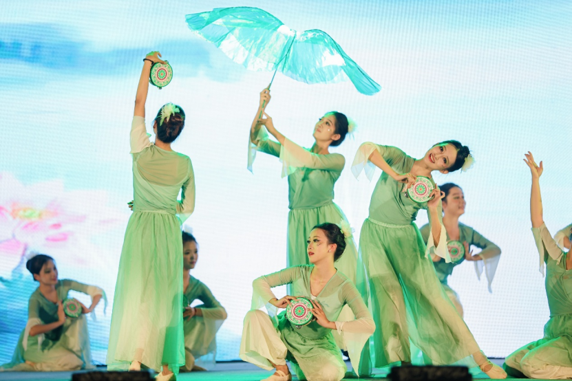 大学生艺术团舞蹈队带来的《莲鼓越歌行》率先登场。舞者身着素白舞裙,如清莲出水,以传统舞蹈的柔美彰显广金人刚正不阿的精神品格。