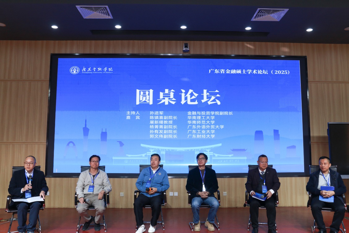 圆桌论坛以“金融硕士教育如何培育面向未来的高端金融人才”为主题,由孙进军副院长主持。华南理工大学陈镇喜副院长、华南师范大学屠新曙教授、广东外语外贸大学杨菁菁副院长、广东工业大学孙有发副院长和广东财经大学郭文伟副院长围绕金融硕士人才培养、课程体系建设、实践能力提升等议题展开热烈讨论。
