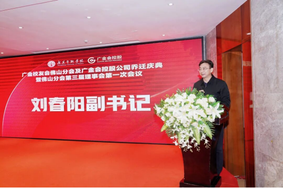 校党委副书记刘春阳在会上致辞。他充分肯定了佛山分会在团结校友、支持学校建设、服务地方发展等方面所发挥的积极作用与重要贡献。刘春阳指出,广大校友是学校事业发展的坚实依靠和宝贵财富,母校始终关心、关注并全力支持校友的成长与发展。他强调,新一届理事会要继续发挥好桥梁纽带作用,不断创新工作机制,深化校企、校地合作,广泛凝聚佛山校友力量,共同为学校高质量发展和服务社会作出新的更大贡献。